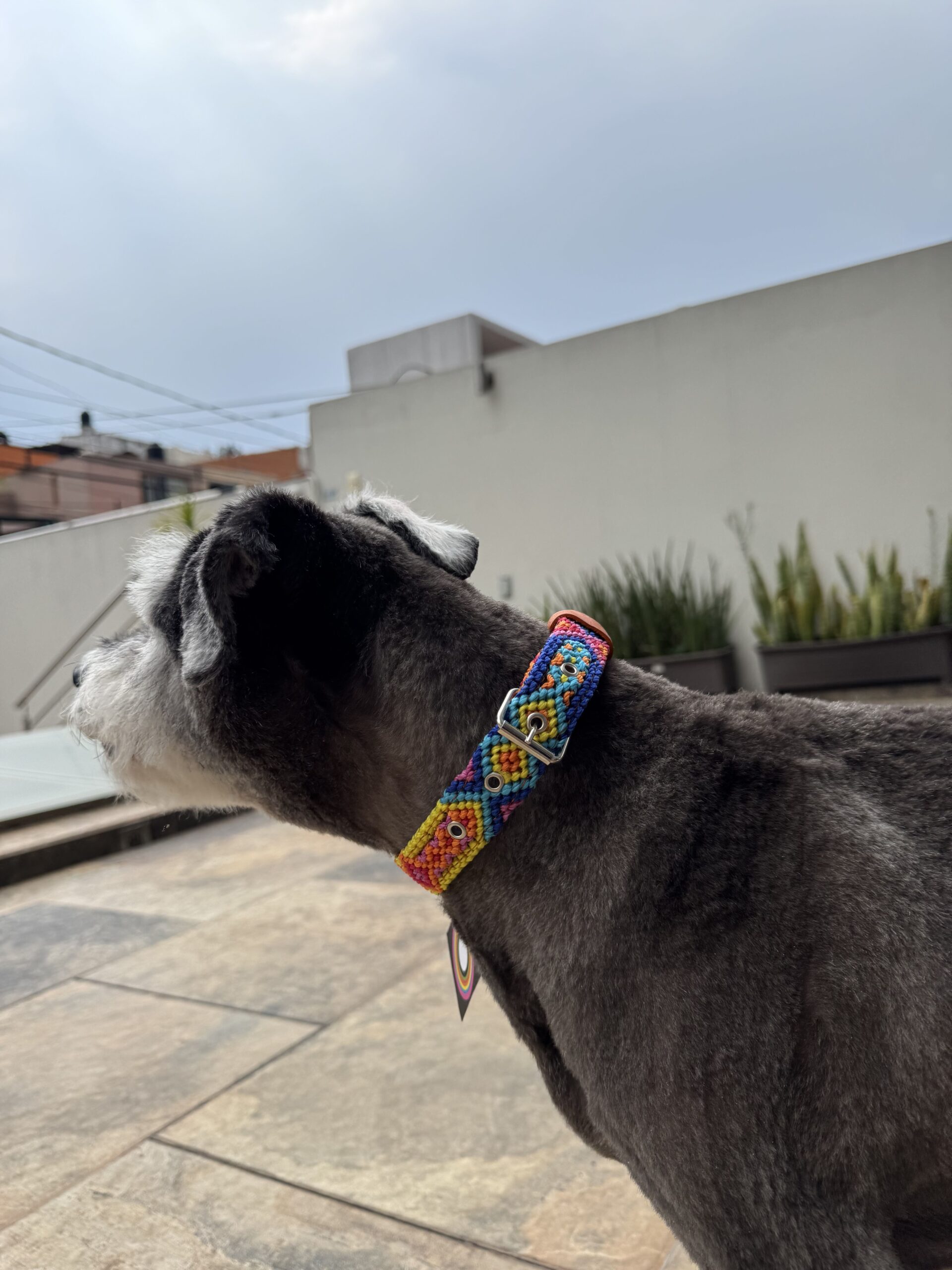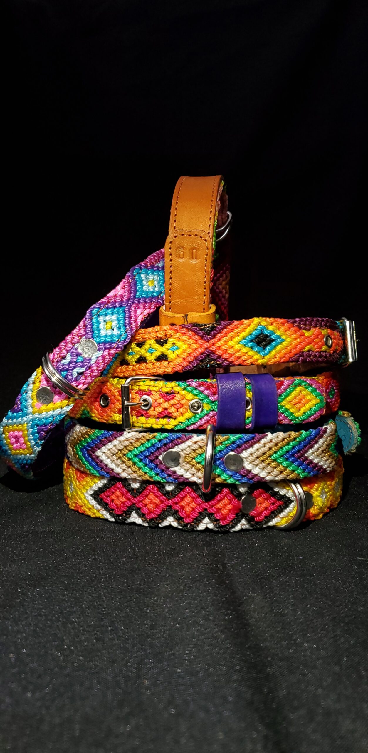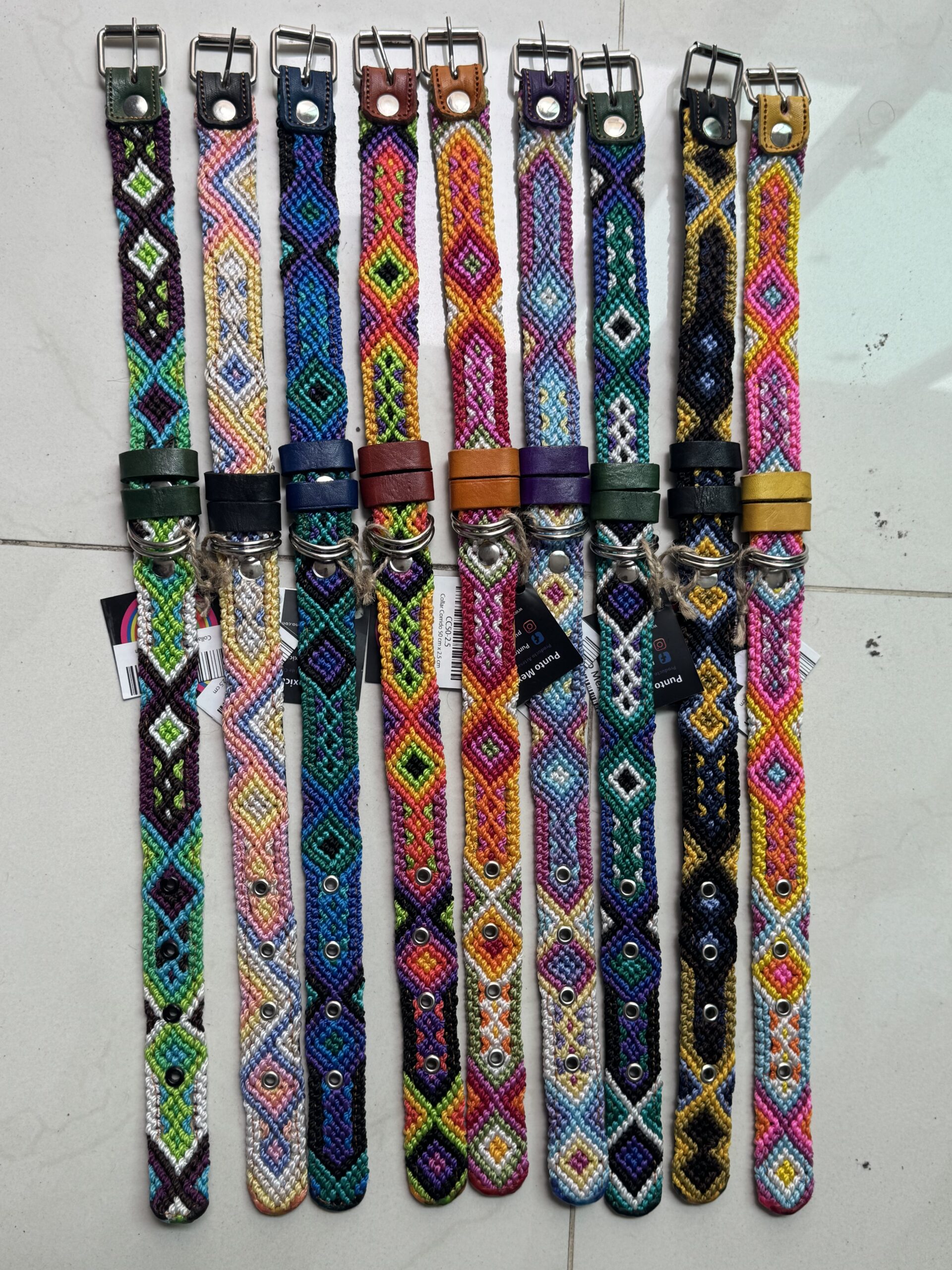 Collar Artesanal para Perro de 2.5 cm de ancho. Deja que tu perro luzca el colorido mexicano. Ideal para razas pequeñas, medianas y grandes. Artesanía de Chiapas. Hecho de piel vacuna genuina en la parte trasera y un entrelazado de hilos coloridos que cubren todo el collar.