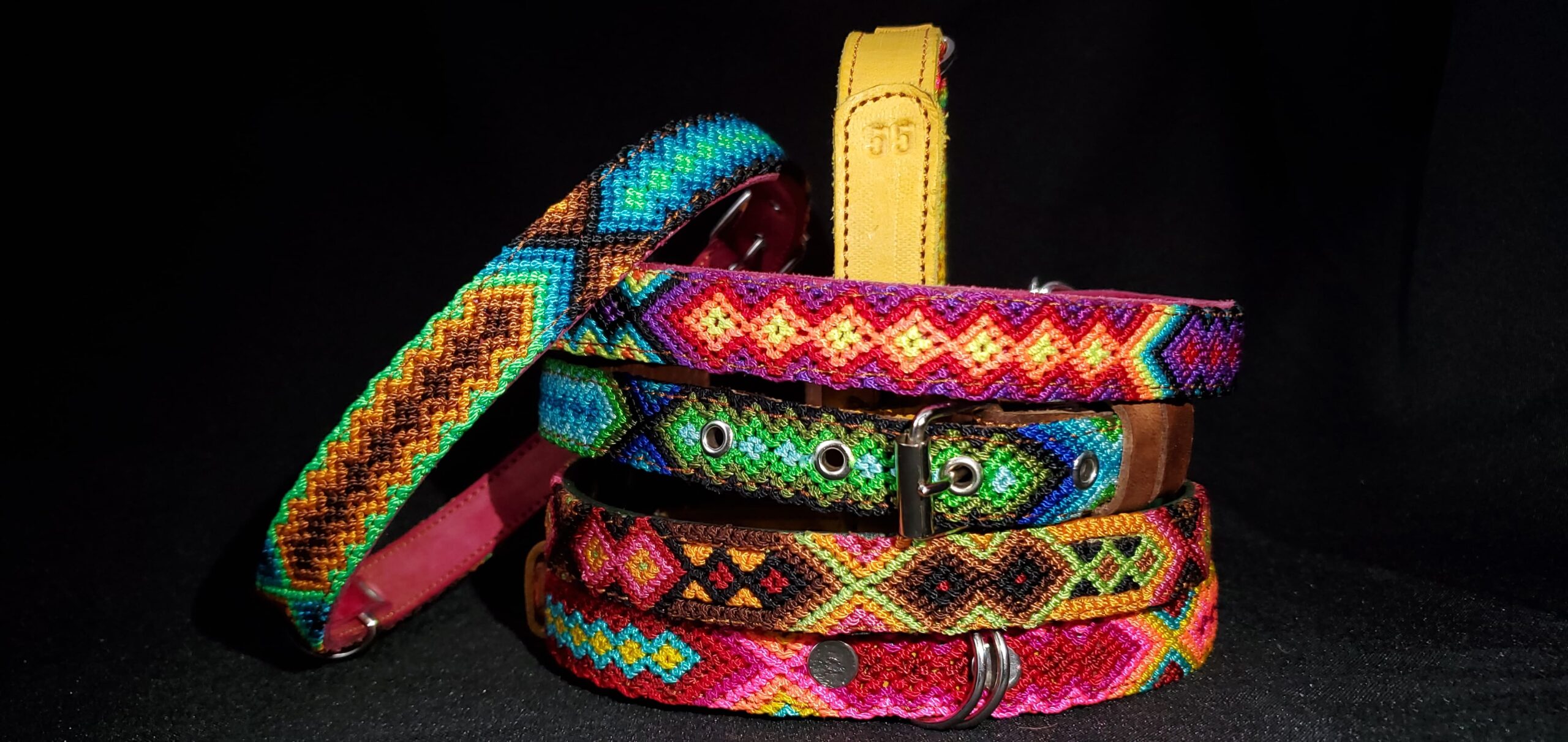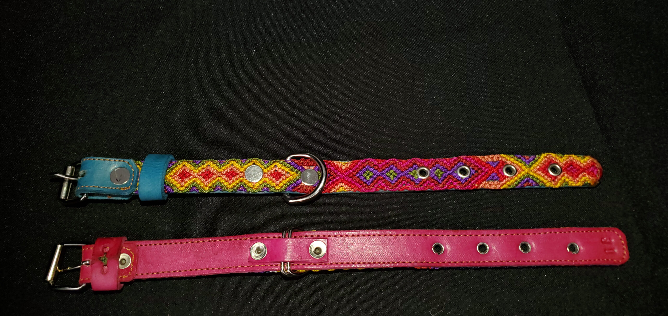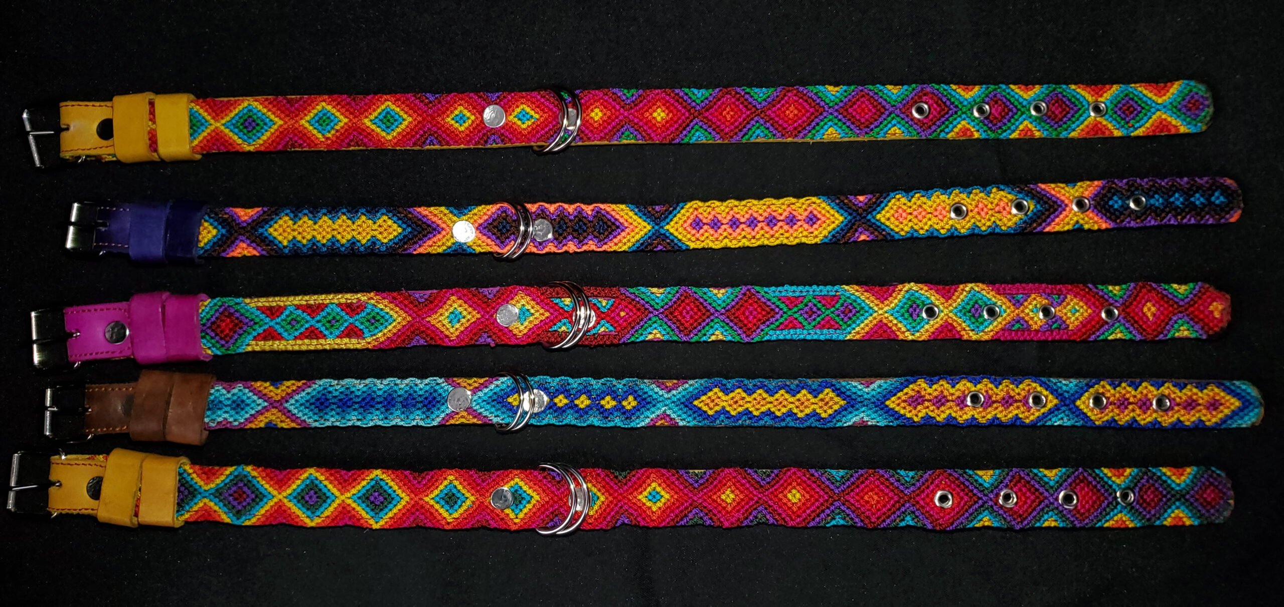 Collar Artesanal para Perro de 2 cm de ancho. Deja que tu perro luzca el colorido mexicano. Ideal para razas pequeñas, medianas y grandes. Artesanía de Chiapas. Hecho de piel vacuna genuina en la parte trasera y un entrelazado de hilos coloridos que cubren todo el collar.